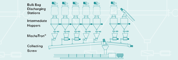 MechaTron® Coni-Steel® Highly accurate and constant volumetric and gravimetric feeding of poorly flowing bulk solids MULTIDOS® M Precise, economical and reliable SacMaster® Universal Bulk Bag Discharge System MULTIDOS® L A feeding system for continuous and batch feeding of bulk materials |